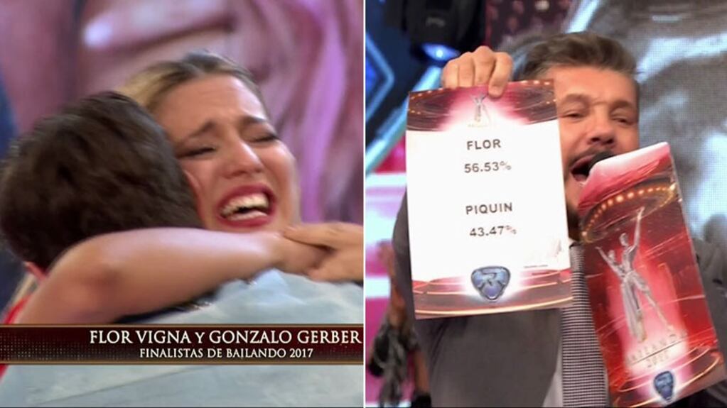“La pareja finalista del Bailando llega a la instancia final del próximo lunes con el 56,53%, la pareja que queda en semifinales queda con el 43,47%. Señoras y señores, son finalistas de Bailando 2017 por elección de la gente… ¡Flor Vigna y Gonzalo Berger! Festeja la tribuna, Flor Vigna está en la final nuevamente”, anunció Marcelo Tinelli para alegría de la defensora del título.