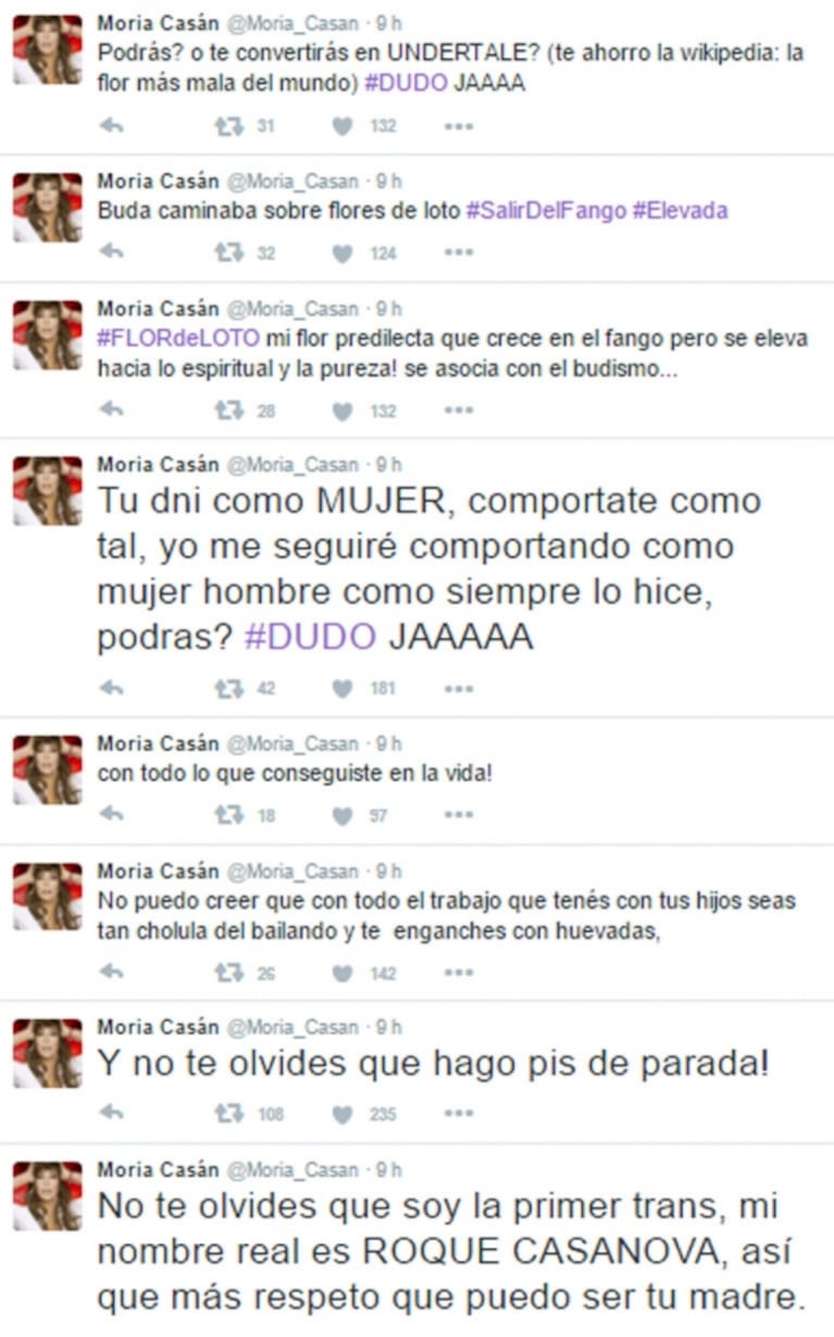 “Querida FLOR: no puedo creer que ser panelista suplente de Bendita te haya quitado el humor, esto es como el tarrito donde orinabas con POLINO. Dudo que vos tengas real sentido de la amistad cuando me invitaste sin ser amiga a tu casamiento para llenar páginas de revistas y a un gran amigo tuyo me lo choqué sentado en una mesa al lado del baño. Hace unos años cuando Flor se comió a CARLOS me patoteabas con lo de diva, que me lo puso el periodismo, no fue tu caso... ¡Y yo te dije que volvieras al calzoncillo y a la máquina de afeitar! Con ironía igual que tu previsible patoteada. Ahora que volviste a la máquina de coser, ¿por qué no me regalás un calzoncillo? Y me dejás de romper las bolas que las tengo bien puestas. No te olvides que soy la primer trans, mi nombre real es ROQUE CASANOVA, así que más respeto que puedo ser tu madre. ¡Y no te olvides que hago pis de parada! No puedo creer que con todo el trabajo que tenés con tus hijos seas tan cholula del Bailando y te enganches con huevadas, ¡con todo lo que conseguiste en la vida! Tu DNI como MUJER, comportate como tal, yo me seguiré comportando como mujer hombre como siempre lo hice, ¿podrás? #DUDO JAAAAA #FLORdeLOTO mi flor predilecta que crece en el fango pero se eleva hacia lo espiritual y la pureza! Se asocia con el budismo... Buda caminaba sobre flores de loto #SalirDelFango #Elevada ¿Podrás? ¿O te convertirás en UNDERTALE? (te ahorro la wikipedia: la flor más mala del mundo) #DUDO JAAAA #AmoMiHermafroditismo #NoEnvidioVaginasNiPenes #SoyElGranPutoArgentinoSalud”.