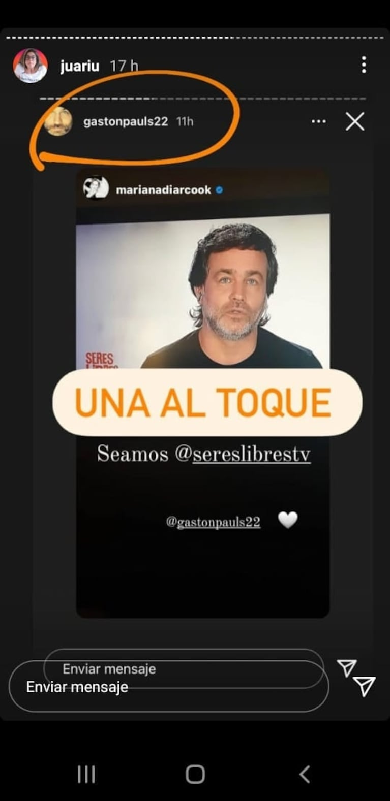 "Seamos 'Seres libres'", expresó Mariana junto a la foto de Gastón conduciendo su programa en Crónica. Además de etiquetarlo, ¡le dedicó el emoji de corazón! Él, en el mismo tono, replicó la tierna storie de su colega.