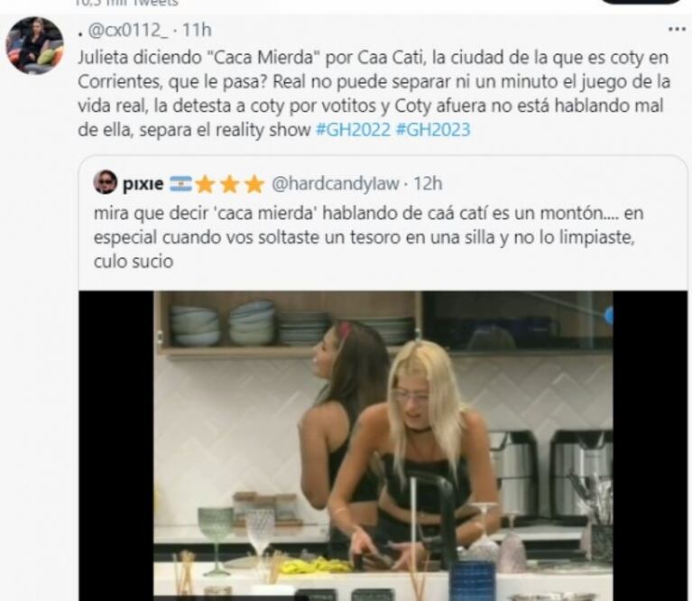 "Las cosas que hice fueron por juego. Pedí disculpas cuando me equivoqué, pero nunca hice nada con mala intención. Ahora, eso es de irrespetuosa, no solo conmigo, también con mis orígenes", tuiteó Coti, en alusión a la conversación entre Alfa y Julieta. Pero apuntó a Poggio.