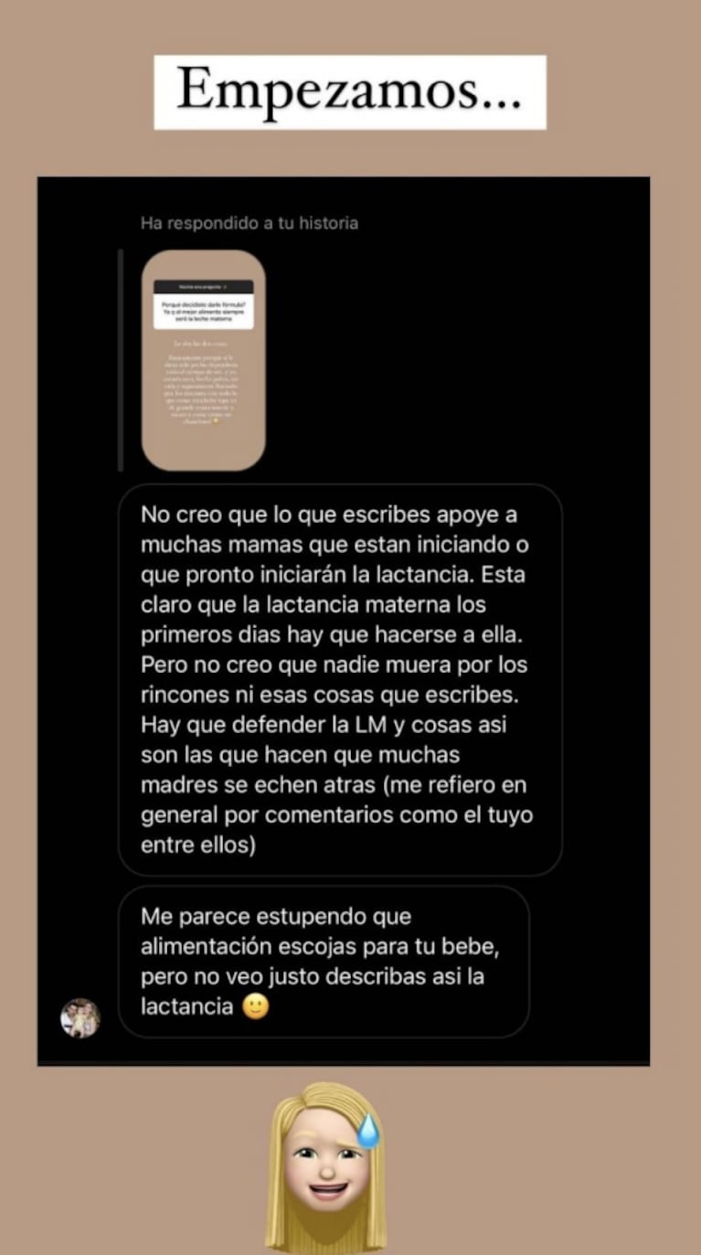 Entonces, recibió un tajante mensaje de parte de una usuaria: "No creo que lo que escribes apoye a muchas mamás que están iniciando o que pronto iniciarán la lactancia. Está claro que la lactancia materna, los primeros días, hay que hacerse a ella. Pero no creo que nadie muera por los rincones ni esas cosas que escribes. Hay que defender la lactancia materna y cosas así son las que hacen que muchas madres se echen atrás (me refiero en general por comentarios como el tuyo, entre ellos)".