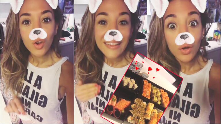 Sin embargo, en otras de las grabaciones compartió una sorpresa que le llegó a su propia casa: "En plena papa frita bajonera, un pretendiente, ponele... un admirador, me manda esto", adelantó, previo a mostrar varias bandejas con piezas de sushi.