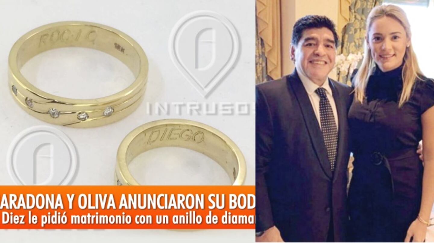 En medio de las especulaciones y el misterio a develar sobre cuándo llegará el gran día, en Intrusos mostraron las alianzas de Diego y Rocío: "Me llegó la foto de las alianzas de Diego Maradona y Rocío Oliva. Mirá qué lindas alianzas de oro, 18 kilates con piedras de diamantes. Esto es exclusivo. Éstas son las alianzas con la que se comprometieron", detalló Damián Rojo al aire.