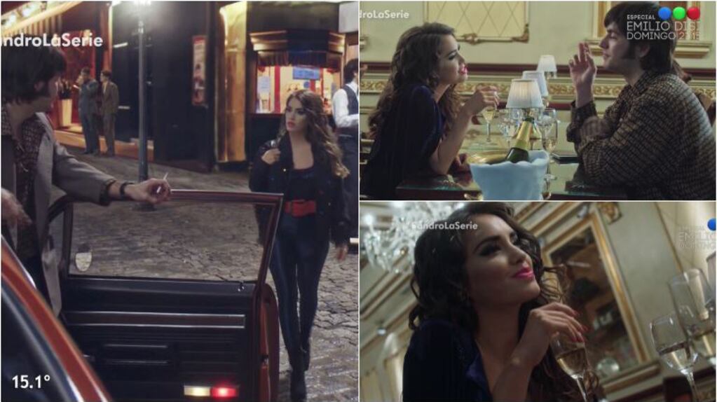 En las primeras escenas de la cantante, Sandro (Caponi) va a buscar al teatro a la bailarina y termina teniendo una romántica cena. “Nos pueden ver y yo me acabo de separar, sino nos besábamos”, menciona ella, antes de que él intente avanzar. “Es la primera vez que alguien me niegan un beso”, se sorprende el cantante, para terminar con un “ya lo sé”, suspirado de la vedette mientras toma champagne.