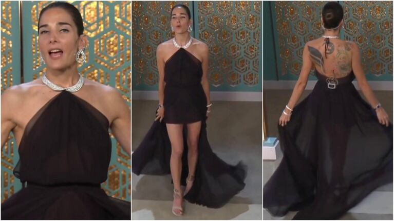 En esta oportunidad, la conductora mostró orgullosa su outfit del diseñador Gino Bogani: “Este vestido es de gasa de seda natural color berenjena oscuro, una belleza”, describió la conductora, orgullosa de su vestido, que acompañó con unas elegantes joyas.
