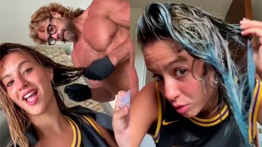 Entregada por completo a las habilidades desconocidas de Luciano Castro como peluquero, Flor Vigna se animó a teñirse el cabello ¡de azul!