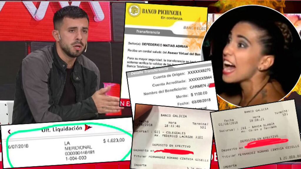 Luego, la producción mostró los recibos acercados por el futbolista: un depósito en efectivo de 20 mil pesos, 1300 dólares del sueldo de la niñera, gastos de la tarjeta de crédito particular de Cinthia, la prepaga, gastos en débito automático como el seguro y la patente de la camioneta y dos facturas de televisión satelital. “¿Ella cree que solo le paso 20 mil pesos?”, se indignó Defederico y en el ciclo detallaron que la cifra sería cercana a los 100 mil pesos.