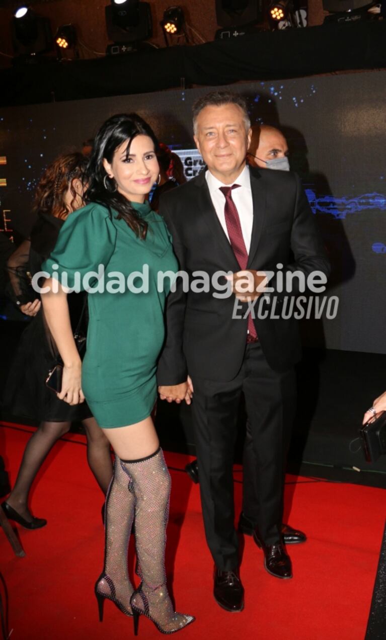 El Pollo llegó acompañado de su esposa, Tefi Russo, quien lució muy sensual con un corset blanco con transparencias y falda blanca.