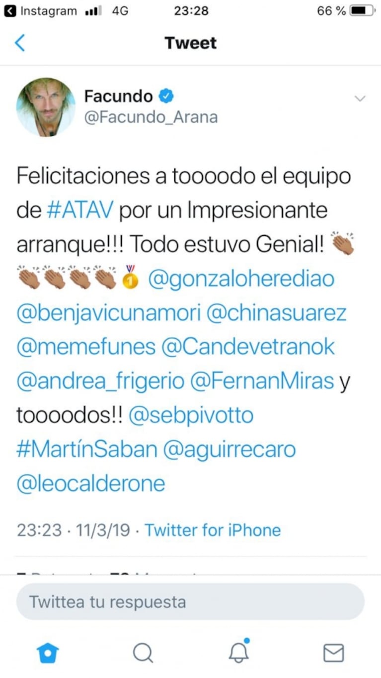“Lo mejor para todo el equipo de ATAV esta noche del estreno. La ficción argentina suma un nuevo capítulo. Éxitos”. En la previa, Andrea Pietra se entusiasmó con la serie: “Con muchas ganas de ver ATAV, ganas y felicidad de saber que se viene un novelón. Bravo Pol-ka y eltrece”.