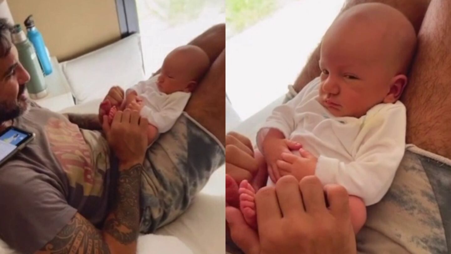 Mientras le mueve las manitos con delicadeza y lo mira con inmenso cariño, el exfutbolista le canta una tierna canción de cuna.