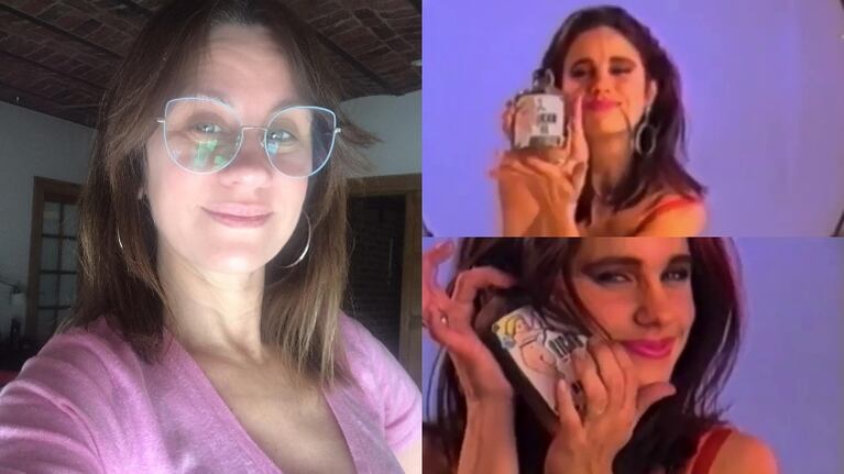 En las imágenes se la ve a la pareja de Pablo Echarri varios años atrás, con un vestido rojo, moviendo el pelo e invitando al público a que se acerque para ver el producto que tenía en sus manos: un licor que agarró con una sonrisa cómplice.