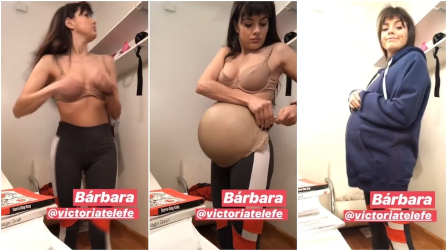En las imágenes que compartió a través de Instagram Stories, se ve a la actriz y cantante poniéndose una panza falsa bajo el pantalón y utlizando accesorios para rellenar su busto, de manera tal que al vestirse se vea reflejado sus notorios cambios físicos, a poco de dar a luz.