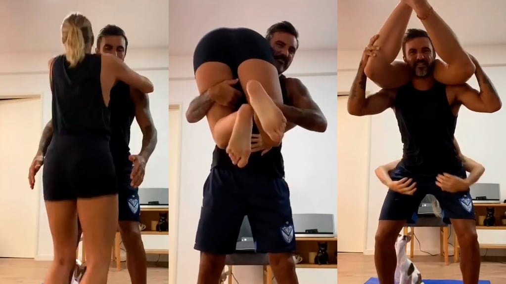 Con la canción de Misión imposible de fondo y una colchoneta en el piso, Fabián le hizo "upa" a Mica y empezó la acción. La idea era que ella trepara por el cuerpo de su pareja ¡sin tocar el piso! y que ambos se animaran a hacer divertidas poses juntos. Mientras tanto, el perro, asustado, se corre al verlos jugar.