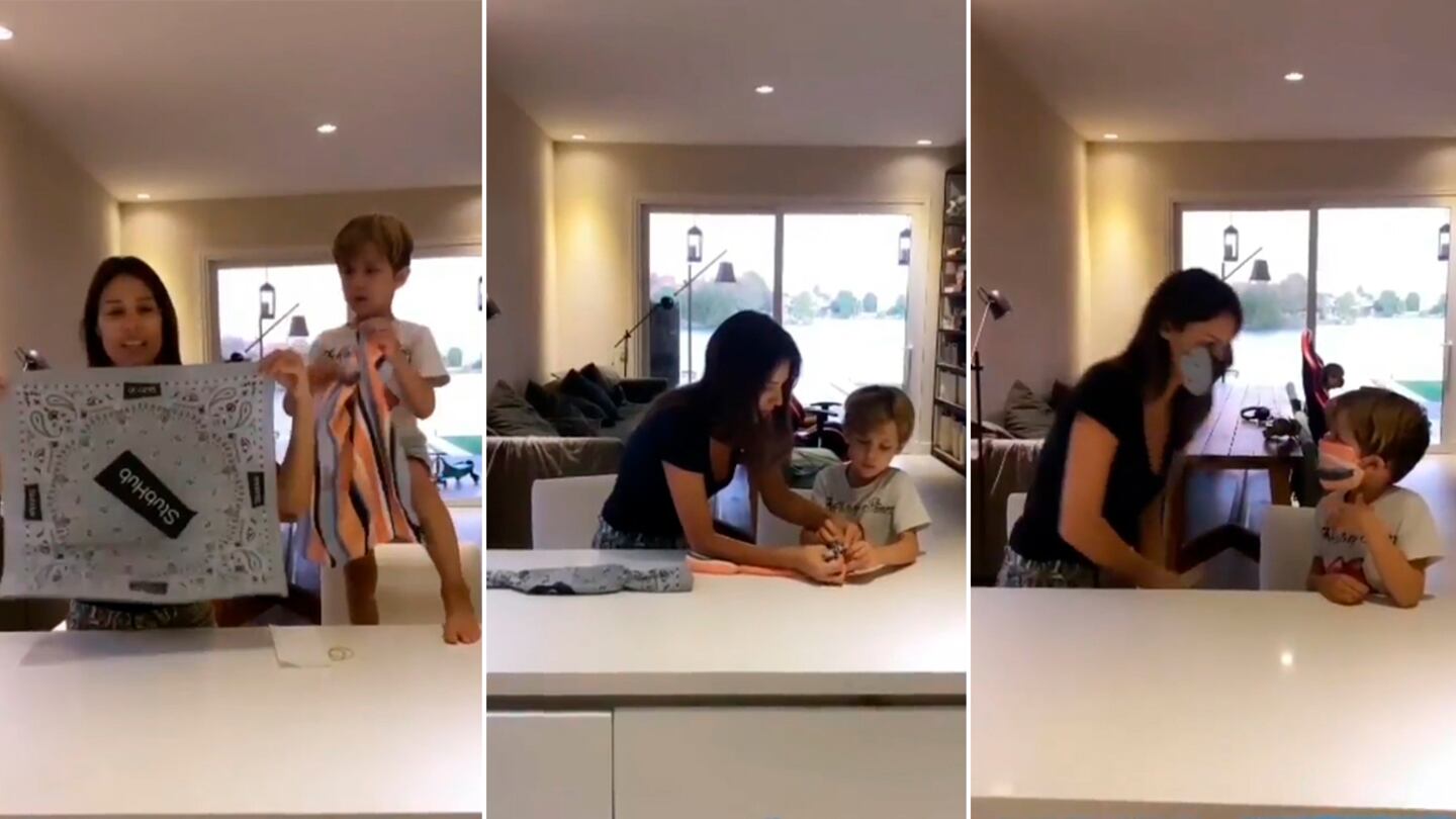 En plena cuerentena obligatoria, a Pampita se le ocurrió hacer con su hijo Benicio un útil tutorial. Madre e hijo agarraron dos pañuelos que tenían en casa y, mientras Roberto García Moritán los filmaba, explicaron el paso a paso de cómo hacer un barbijo casero.