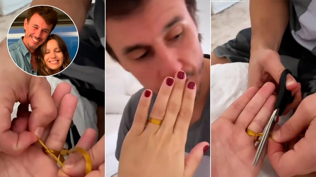 ¿Qué hizo el empresario? Le ató una cinta al dedo como anillo que simbólicamente reemplazaría la alianza, al menos hasta que Pampita pueda volver a usarla. Conmovida por la actitud de su marido, la conductora compartió el video del tierno momento a través de sus redes sociales.