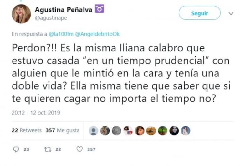"¡¡¿Perdón?!! ¿Es la misma Iliana Calabró que estuvo casada “en un tiempo prudencial” con alguien que le mintió en la cara y tenía una doble vida? Ella misma tiene que saber que si te quieren cagar, no importa el tiempo, ¿no?", disparó la coequiper de Ardohain en Twitter en respuesta a un retweet de Ángel de Brito, dejando en claro para dónde se orientan sus lealtades.