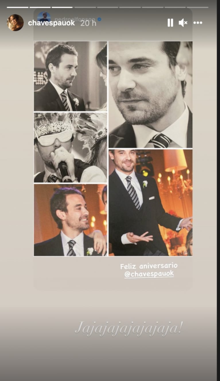 Acto seguido, la conductora replicó a través de sus stories de Instagram un divertido collage que su marido hizo con fotos retro del día de su boda y le sumó un inmenso "ja, ja, ja, ja".