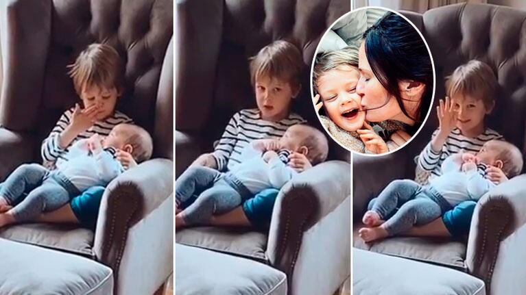 Un claro y súper tierno ejemplo es el momento hogareño que la conductora capturó con su celular, de su niño sosteniendo a upa a Filipa, mientras le canta la canción infantil Estrellita dónde estás.