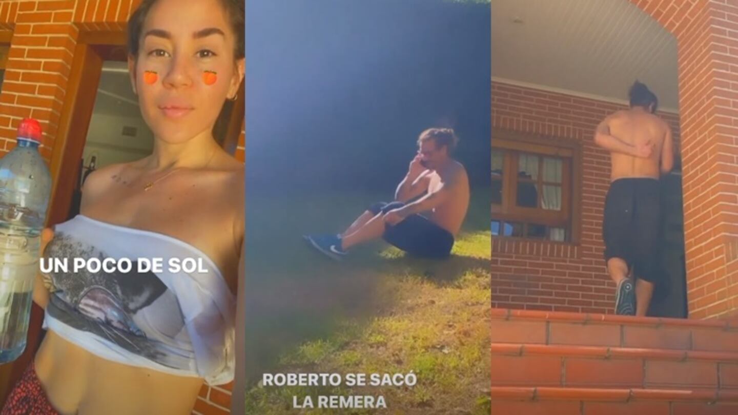 "Un poco de sol", escribió Jimena en la primera historia que subió a su red social, enfocándose a ella misma. Luego giró la cámara del celular y agregó, divertida: "Roberto (por Daniel) se sacó la remera. No mires, no mires, no mires", dijo Barón, mientras Osvaldo caminaba hasta la casa en cuero.