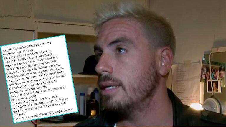 Enfrentado a su hermana y en el centro de la atención de los medios, Fede decidió abrir su corazón en Instagram, donde compartió un sentido descargo: “En los últimos 3 años me pasaron miles de cosas. Tuve la enorme bendición de que la mayoría de ellas fueron maravillosas”, arranca el texto Bal. "El público nos acompaña. Se ríen, se emocionan en cada función. Parece que todo es ideal y en un punto lo es. Pero nada es gratis. Cuando mejor te va, más te cuesta. Las críticas se multiplican. Y casi no hay un día en el que no digan ‘Fede estuvo mal porque...’”.