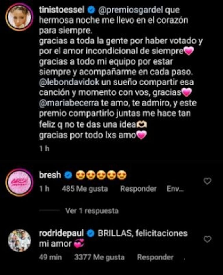 Después del gran evento dedicado a la música, Tini compartió su emoción en Instagram: “@PremiosGardel, qué hermosa noche me llevo en el corazón para siempre. Gracias a toda la gente por haber votado y por el amor incondicional de siempre. Gracias a todo mi equipo por estar siempre y acompañarme en cada paso”, comenzó diciendo.