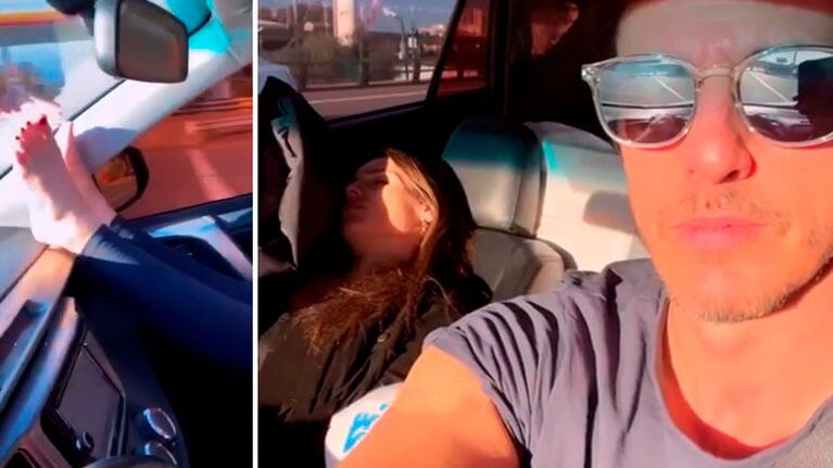 El empresario compartió un pícaro video, en el que se la ve a la modelo y conductora, durmiendo en el auto, con los pies en alto, para mejorar la circulación ante la hinchazón. "Pampita", escribió Roberto en Instagram Stories, junto al emoji de un corazón, sobre las imágenes menos glamorosas, pero sin dudas más tiernas, de Carolina, descansando mientras él conduce el auto.