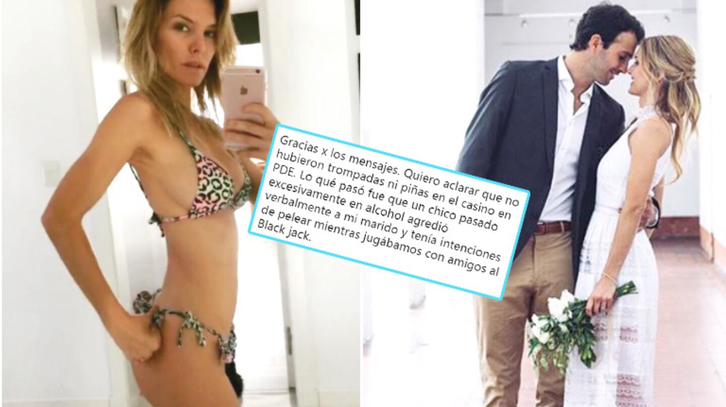 Ante las repercusiones, la modelo decidió recurrir a las redes sociales y aclarar lo sucedido: "Gracias por los mensajes. Quiero aclarar que no hubo trompadas, ni piñas en el casino en Punta del Este. Lo que pasó fue que un chico, pasado excesivamente en alcohol, agredió verbalmente a mi marido y tenía intenciones de pelear mientras jugábamos con amigos al Black Jack", expresó a través de su cuenta personal de Twitter.