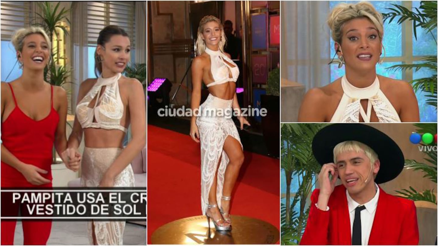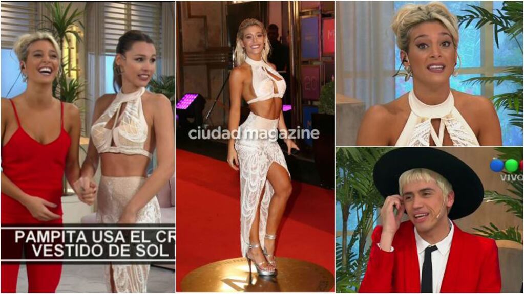 Unos minutos después, tras un corte, las mujeres intercambiaron sus looks y Sol pasó a usar el mono que tenía puesto Pampita y la modelo, el “vestido de la polémica”. Pampita quedó contenta con su look, pero Benito Fernández, otro de los invitados, le bajó el pulgar: “A mi me encanta, pero no para el Martín Fierro”.
