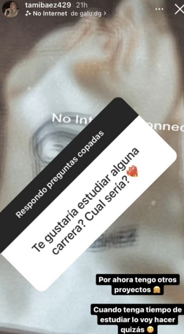 "¿Te gustaría estudiar alguna carrera? ¿Cuál sería?", le preguntaron a través de sus stories de Instagram.