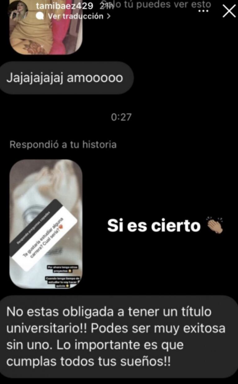 "No estás obligada a tener un título universitario, podés ser muy exitosa sin uno. Lo importante es que cumplas todos tus sueños", le dijo un seguidor tras su respuesta.