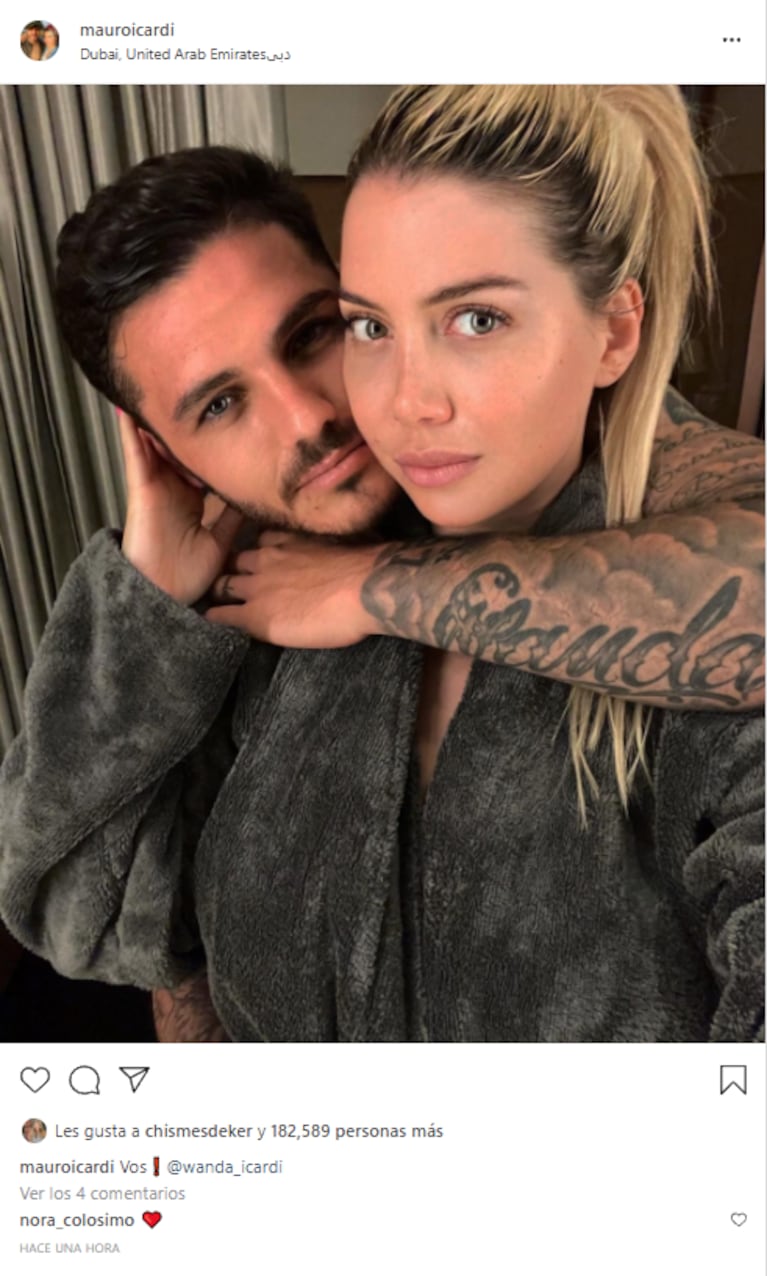 Casi al mismo tiempo que su esposa, el jugador del París Saint-Germain publicó una selfie hot en donde él aparece sin remera abrazando a la empresaria, que lleva una bata sin aparentemente nada debajo. “Vos, Wanda Icardi”, le escribió, unas horas después de mostrar la romántica cena que tuvieron en Dubai.