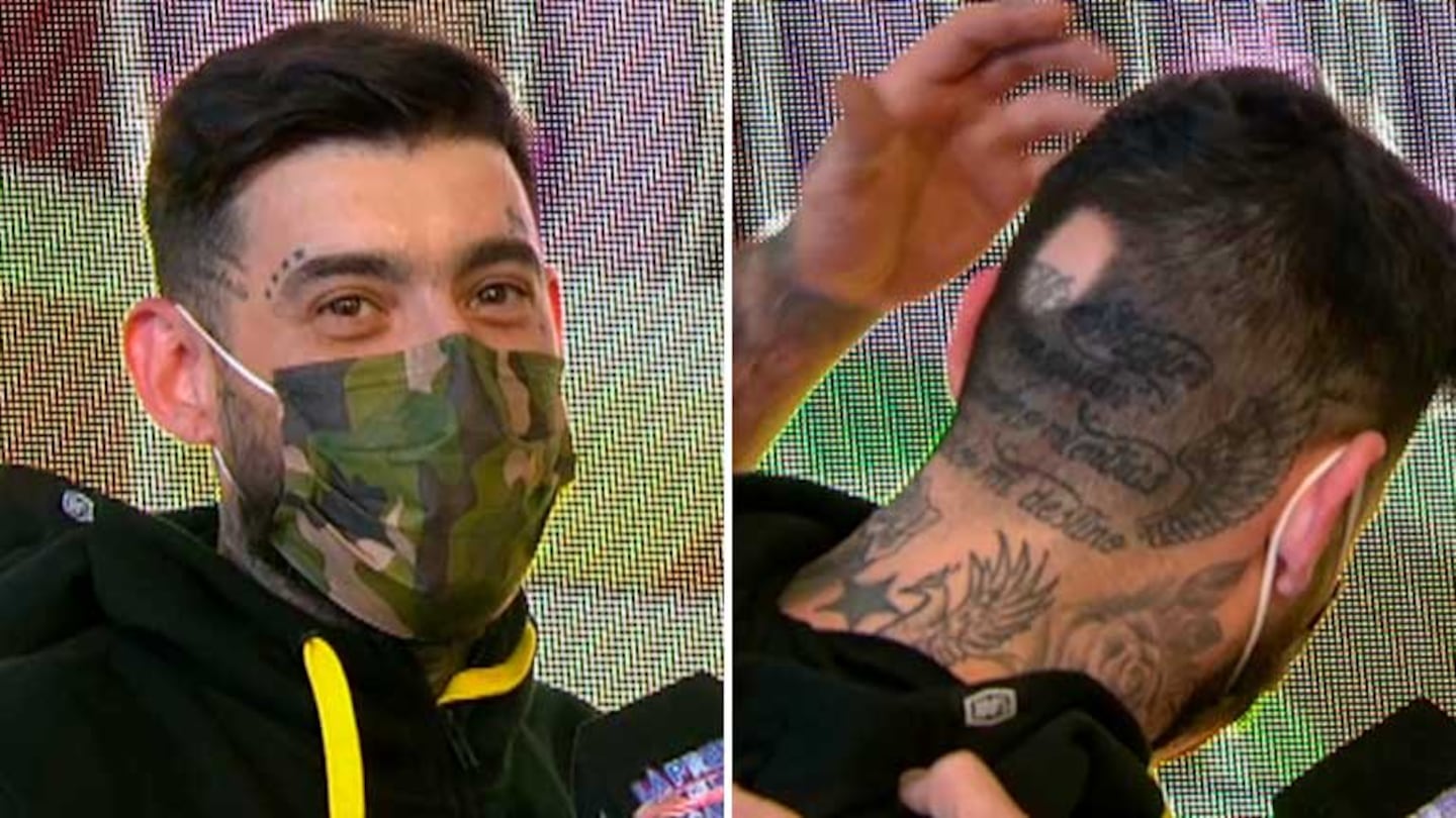 “Tengo un problema acá de calvicie por estrés, pero el resto está todo tatuado y en las otras zonas del cuerpo también tengo tatuajes. Pero duele más en la cabeza de uno que en la del miembro”, aclaró Ulises Bueno, que sorprendió al notero y a los conductores con esta revelación.