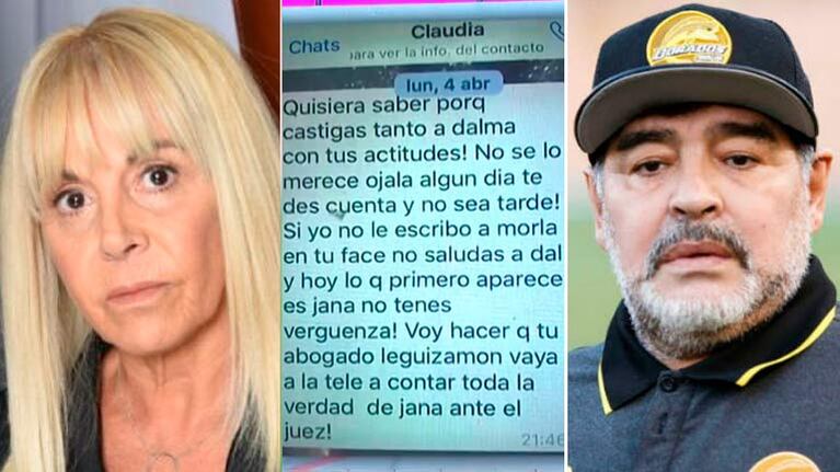 A un día de que Claudia Villafañe se consagrase campeona de MasterChef Celebrity, Luis Ventura mostró un fuerte mensaje de WhatsApp que la empresaria le envió a Diego Maradona en abril del 2020. En el texto, la mamá de Dalma y Gianinna le echa en cara a su ex la forma en la que maltrata a la mayor de las hijas al no saludarla por su cumpleaños y le reprocha que priorizaba a Jana en sus redes sociales.