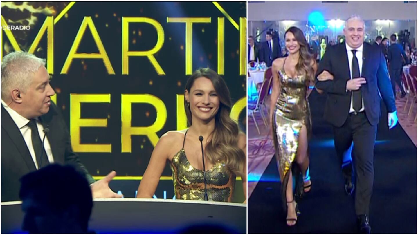 Acompañada por Mariano Peluffo, su compañero en la conducción de la gala que organiza Aptra, Carolina entró al salón del Hotel Sheraton enfundada en un vestido dorado con un gran tajo a un costado, muy inspirado en el mismísimo galardón.
