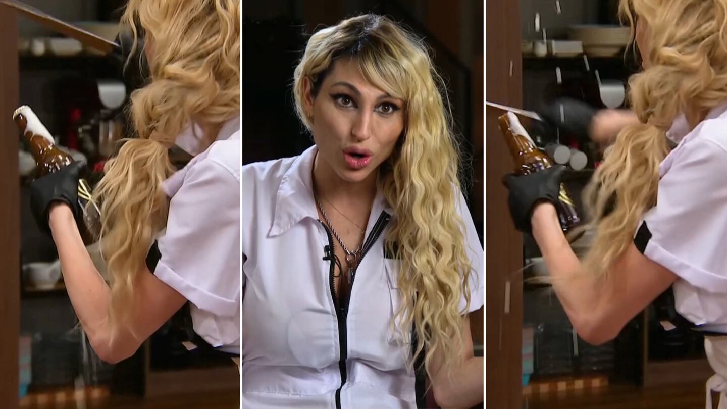 La participante agarró el elemento cortante y consiguió, después de haber hecho muchísima fuerza, destapar la botella. Un poco de cerveza salió disparada y manchó su cocina, pero la participante logró su cometido.
