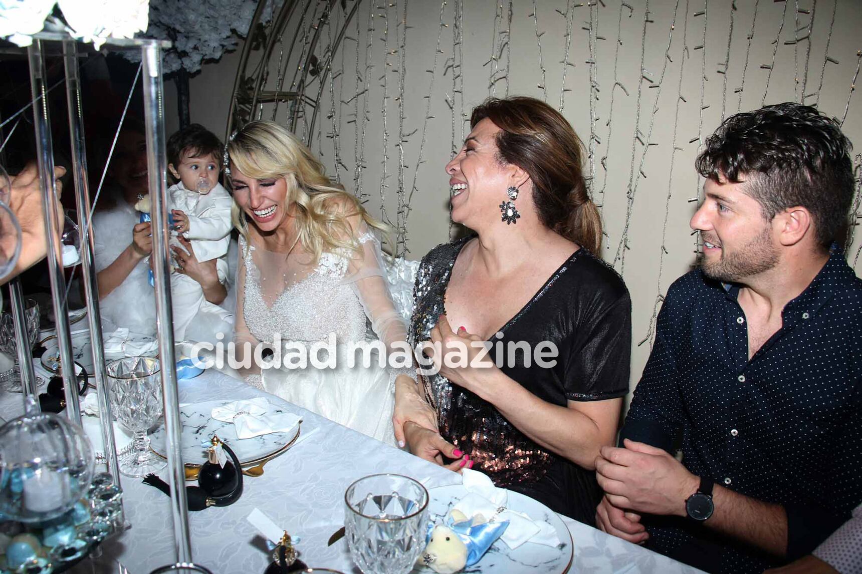 El evento fue en un salón de Puerto Madero, y como si se tratara de una boda, Vicky bajó de un elegante auto antiguo de lujo con un vestido blanco y con su hijo en brazos. Muy coqueto, Salvador Uriel lució un traje blanco con una simpática galera, y Ciudad lo retrató con su sonrisa detrás del chupete.
