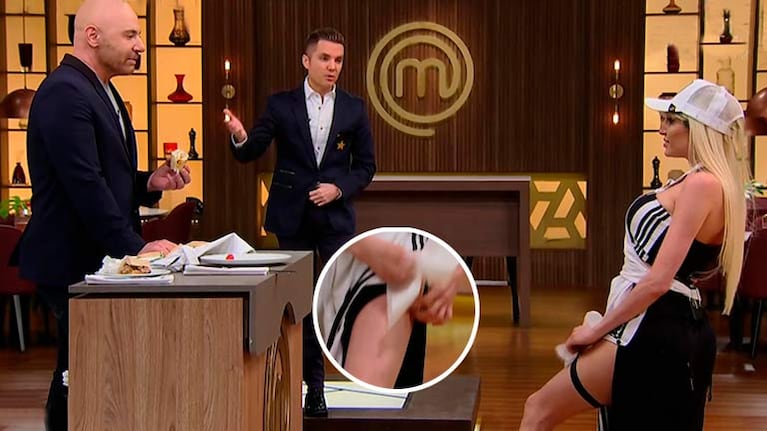 Pero eso no fue todo ya que cuando Donato de Santis se dio cuenta de que no tenía nada con qué limpiarse la boca, ella extrajo hojas de rollo de cocina que tenía dobladas en una liga en su pierna derecha y lo dejó atónito. “¡Para Tano, no te manches! Traje servilletas en las ligas, una cocinera tiene que estar siempre preparada”, dijo Vicky ante la atenta mirada de Germán Martitegui.