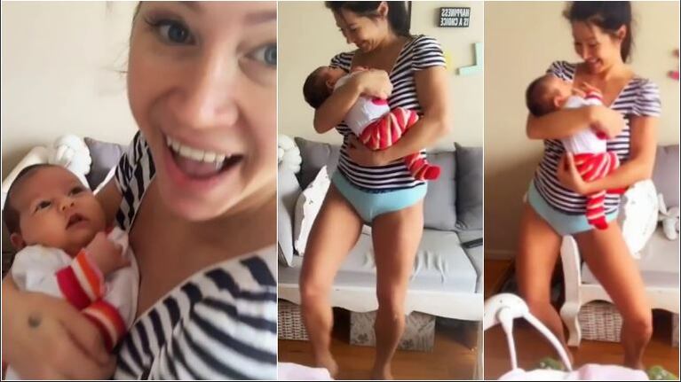 La exvedette se mostró en la red social moviéndose al ritmo de la música con su hija en brazos. “¡Bailando con Lola recuperé mi figura! (Más o menos) ¡Pero es necesario que sea en bombacha, aclaro! Con mis dos temas preferidos @baronjimena y @laliespositoo”, escribió, con humor mientras se mueve en ropa interior con su hija. ¡Y la sonrisa de la nena es divina!