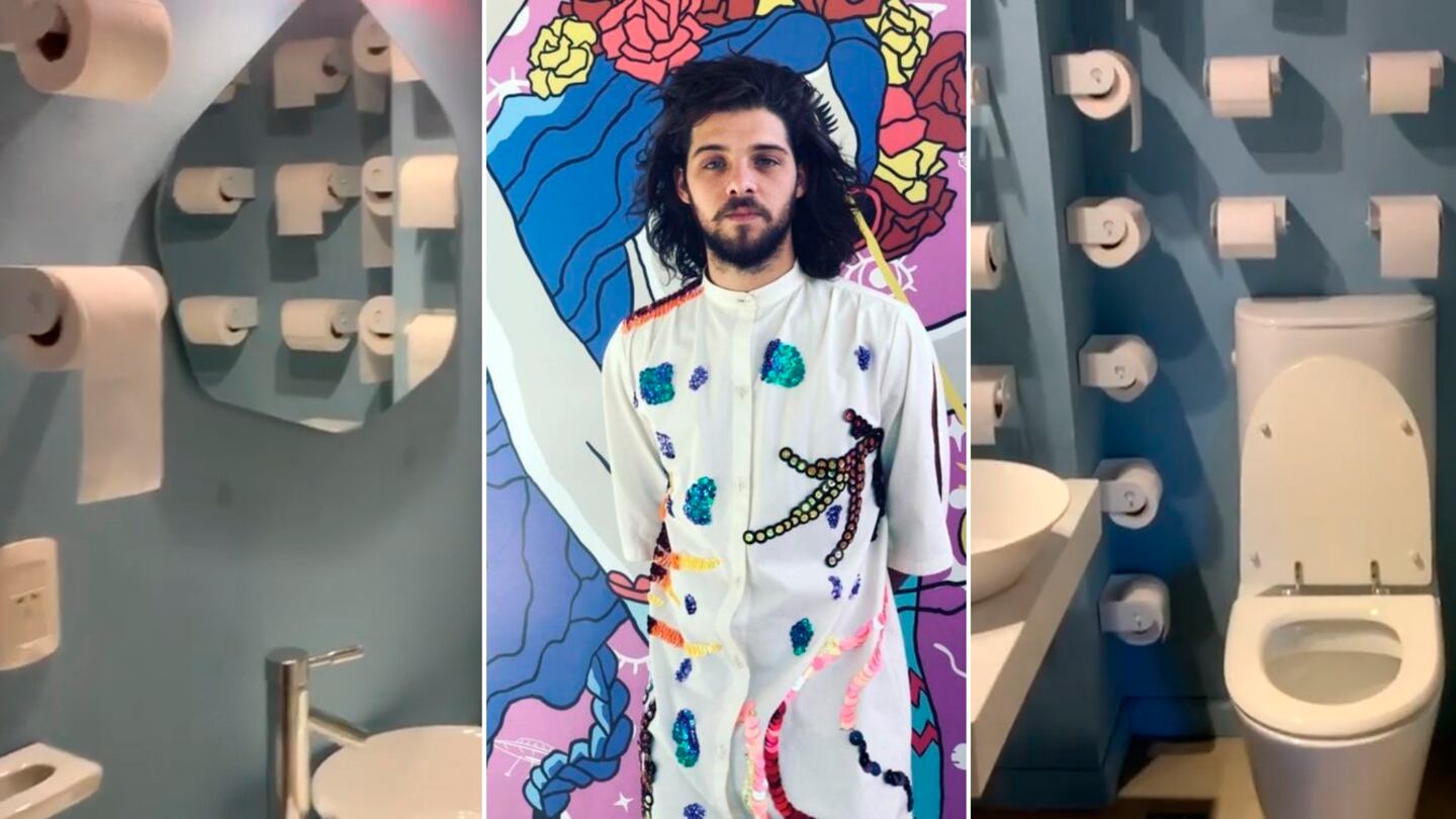 Sí, el influencer convirtió su baño en una instalación propia de una galería. En los techos y las paredes celestes se pueden ver aplicados un montón de rollos de papel higénico. ¿Cuántos? ¡97!