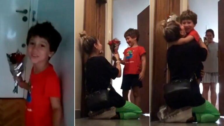 El pequeño la esperaba ansioso con un bello ramo de flores, que rápidamente le entregó a su mamá ni bien le abrió la puerta de su hogar.