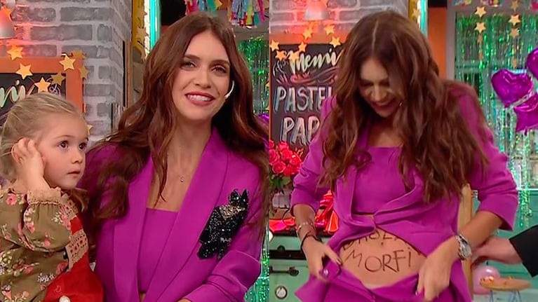 Después le tocó el turno de decorar una torta de cumpleaños y en ella agregó un chupete, un babero y un body de bebé a modo de confirmación del embarazo. Su hijita Malaika se acercó a su mamá y ella le preguntó: “¿Querés que les contemos? ¿Qué tiene mamá en la panza?”. Y entonces mostró su pancita, donde tenía escrito “Hola Morfi”.