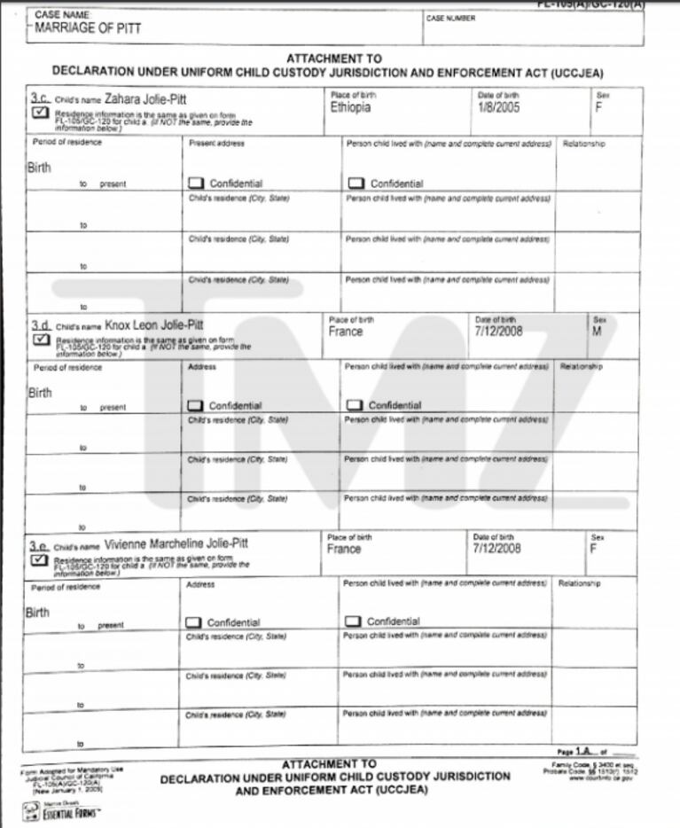 El sitio estadounidense TMZ hizo públicos los papeles de divorcio que presentó la actriz ayer ante la Justicia de Los Ángeles, donde alude a "diferencias irreconciliables" que la llevaron a solicitarle al juez un pedido para tener la custodia de sus hijos Maddox (14), Pax (13), Zahara (11), Shiloh (10), Knox (8) y Vivienne (8), sin exigir responsabilidades financieras y con acceso al régimen de visitas para Brad Pitt.