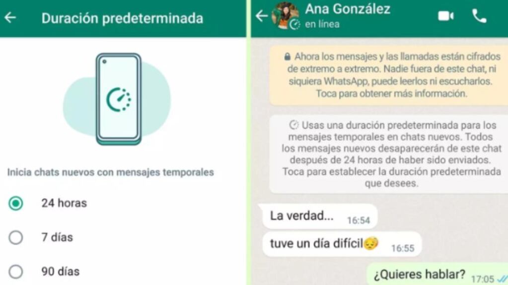 Los mensajes temporales, una vez activados, desaparecen al cabo de siete días, hasta ahora la única opción temporal disponible. Desde este lunes, también se puede elegir entre otras dos nuevas duraciones: 24 horas y 90 días.