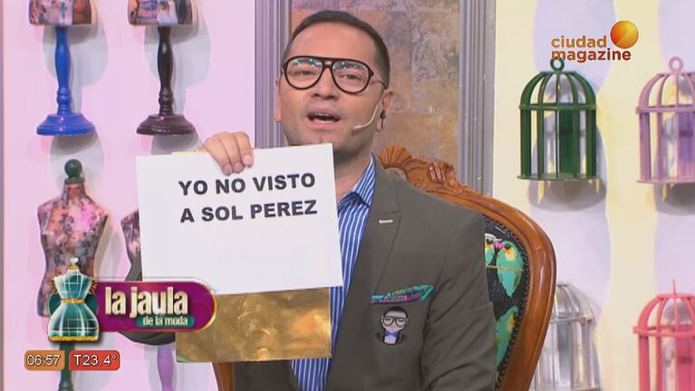 Hace tiempo que La Jaula viene advirtiendo que en el programa de Pampita no muestran el look de Sol Pérez. Pero el programa de hoy, mostramos que gracias a Benito Fernández logramos que esto suceda. El diseñador expresó "Sentí que ellas se odian".