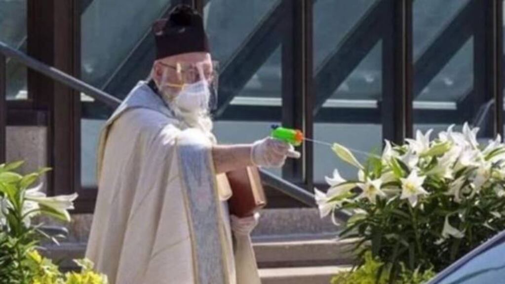 Su nombre es Tim Pelc y es sacerdote de la iglesia San Ambrosio, en Detroit, Estados Unidos. Las imágenes que lo muestran en la singular faena se volvieron virales en las redes sociales, debido al impacto de ver al religioso en la puerta de la parroquia, tirando agua bendita con una pistola.