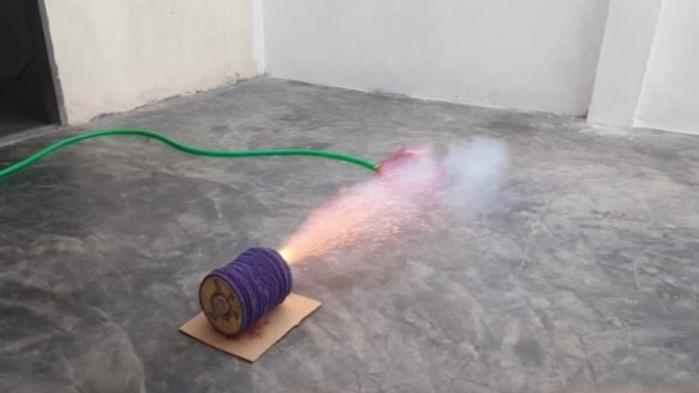 Una vez unidas todas las cerillas, las encendió para probar la potencia de la llama creada. A continuación, colocó un globo de agua cerca, y examinó si la llama sería lo suficientemente fuerte como para reventarla, o si el agua del interior del globo absorbería el calor en su lugar.