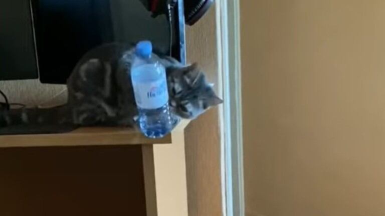 Sin embargo, no se esperaba lo que estaba a punto de suceder. Sanechka, nombre de la gata, dejó caer la botella de agua al suelo consiguiendo que quedara apoyada encima de la tapa. Una proeza que pocas personas serían capaces de hacer pero que la gata logró con gran agilidad.