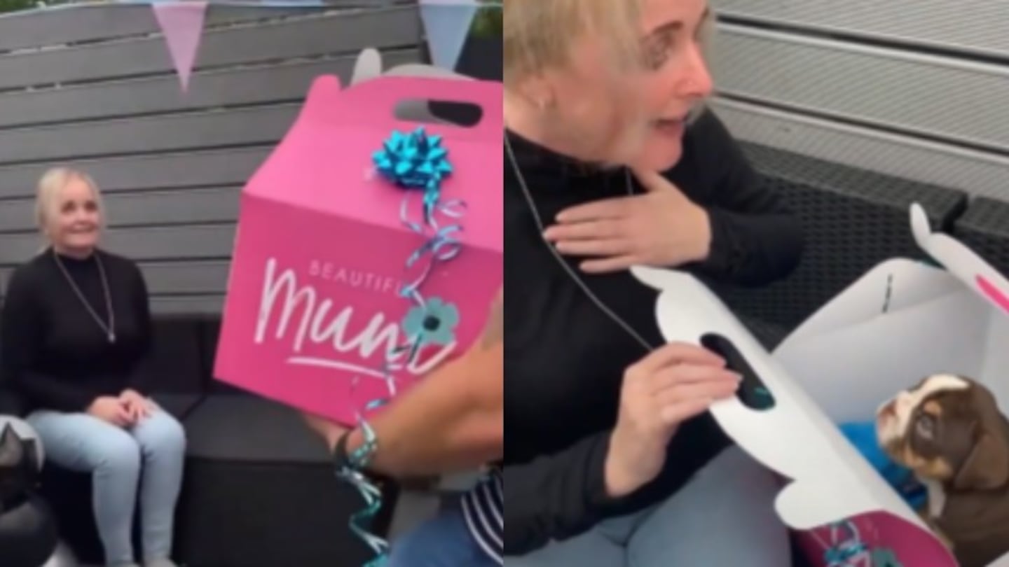 Trevor puso una caja rosa al lado de Jo, y cuando ella la abrió, Walter, un cachorro de bulldog británico salió para recibirla.
